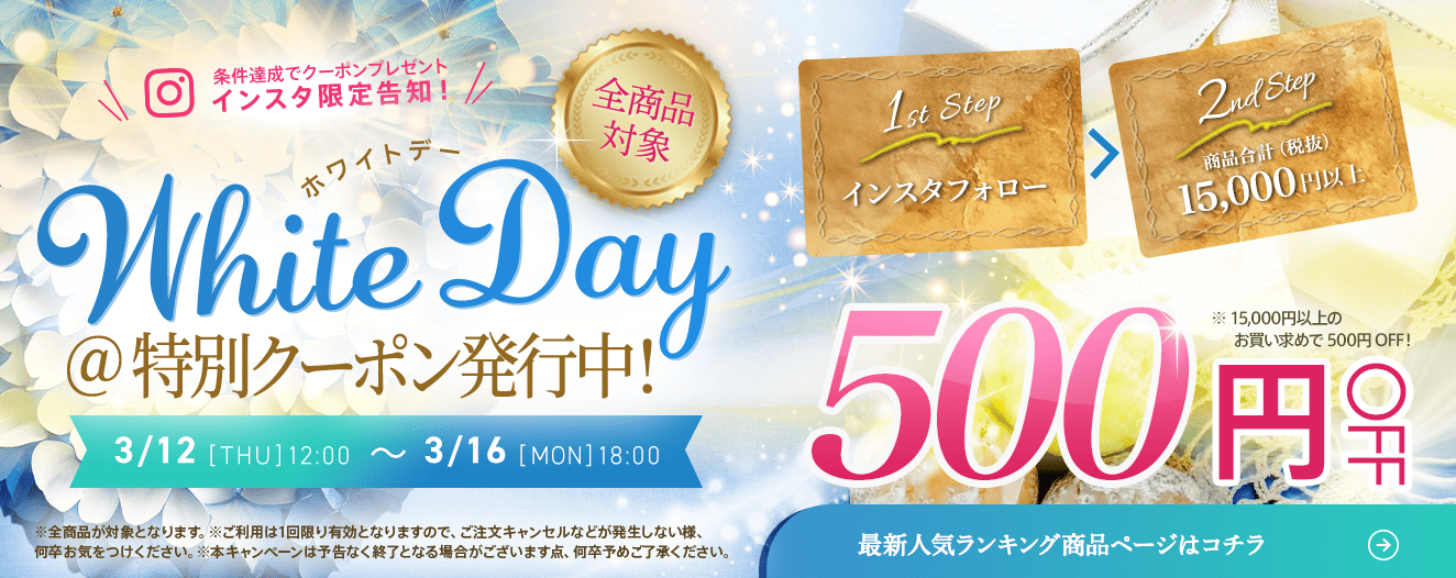 インスタ限定告知!フォローしてホワイトデー特別クーポン[500円 OFF]をゲット!!(2025年03月14日(金)18:00 まで)